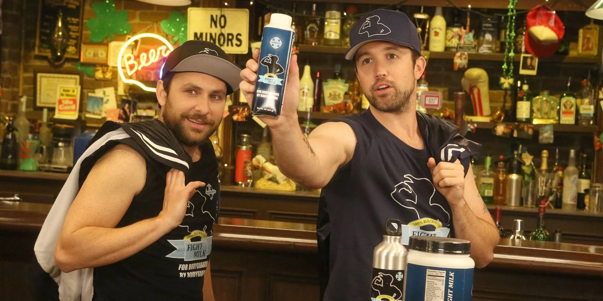 In the season viii episode "Frank's Back in Business organisation," Mac and Charlie create their own alcoholic, "crowtein-based" sports beverage, Fight Milk ("For bodyguards!" "...By bodyguards!"), and pitch it at one of Frank's investor meetings.